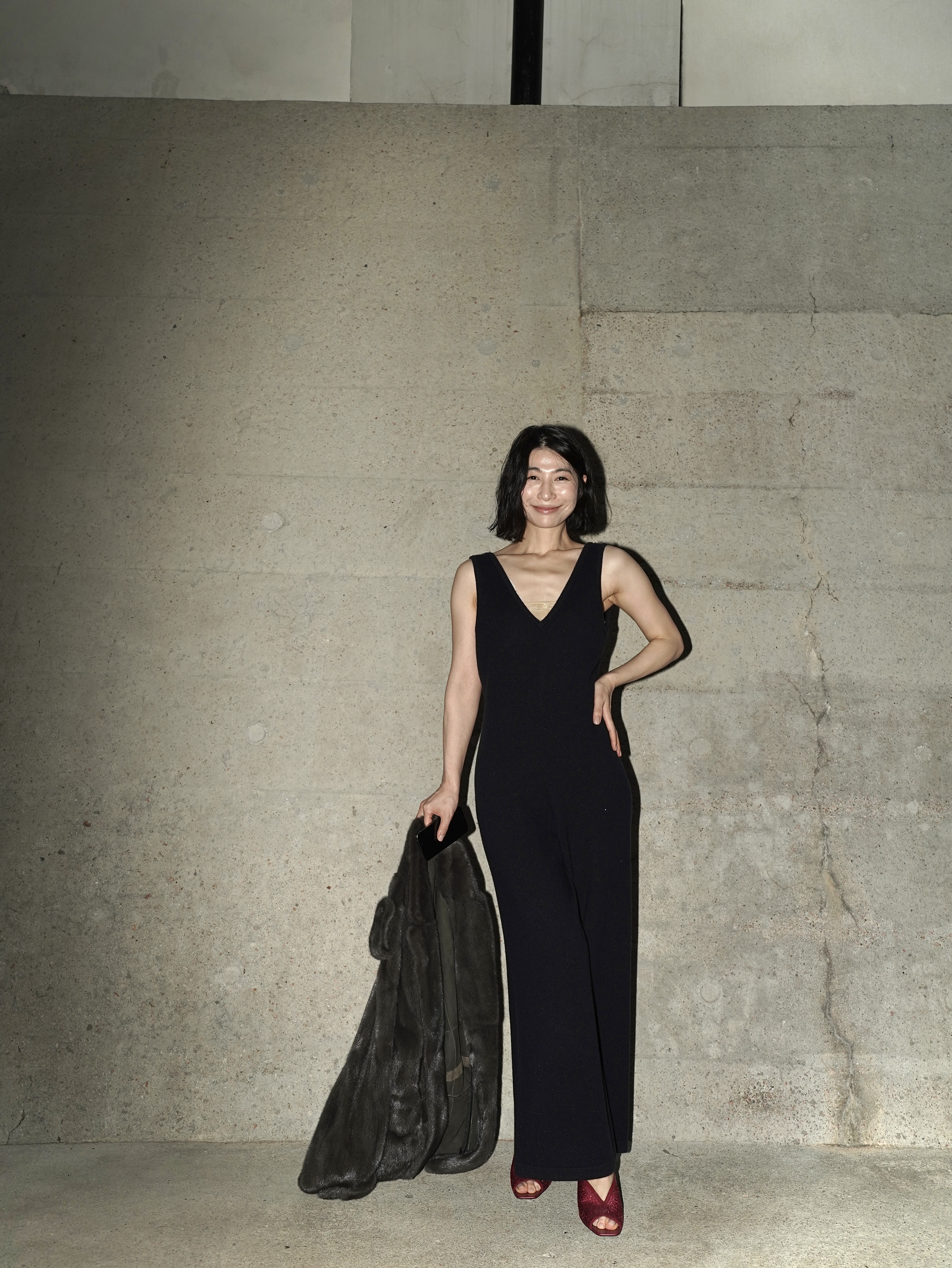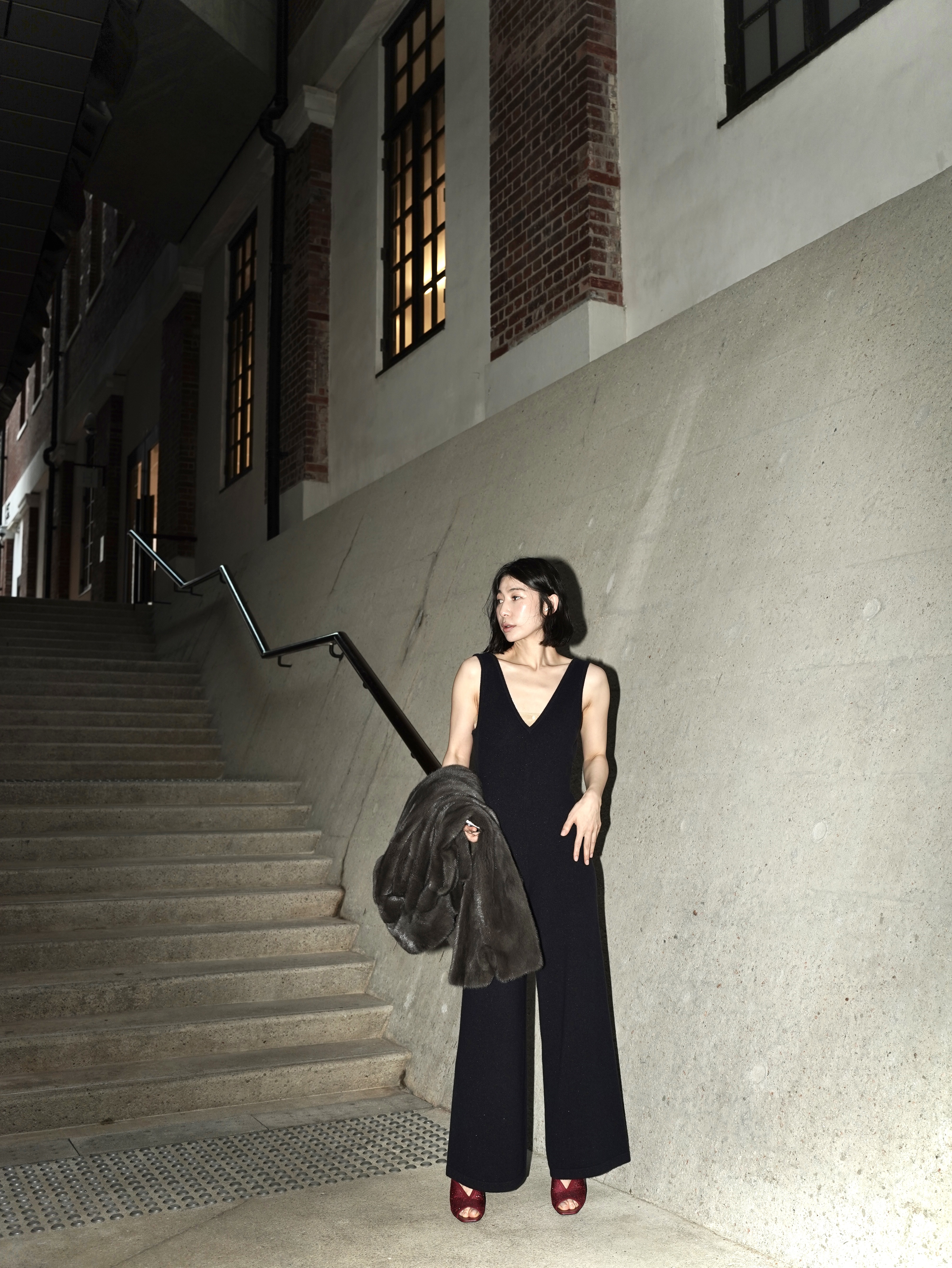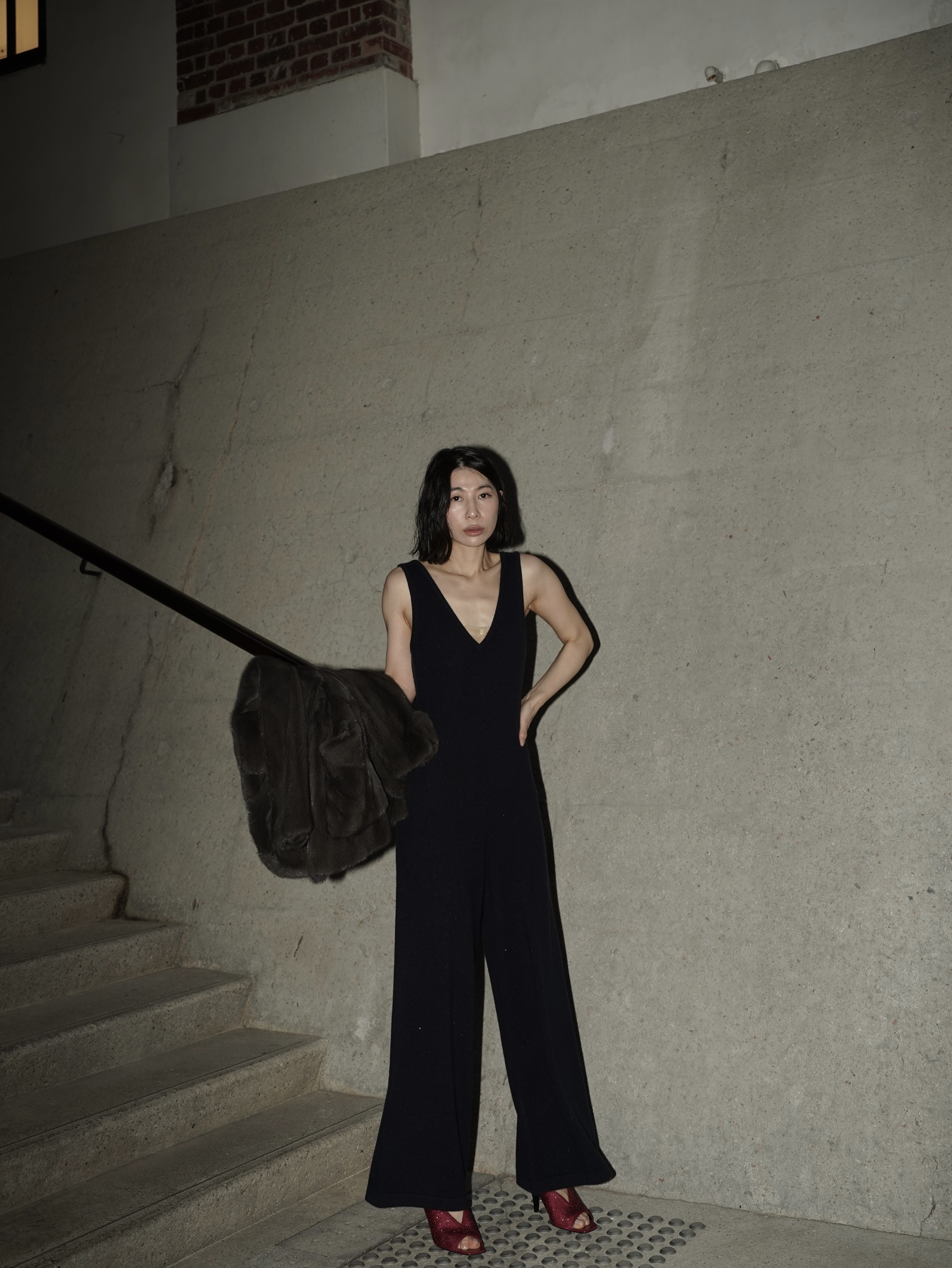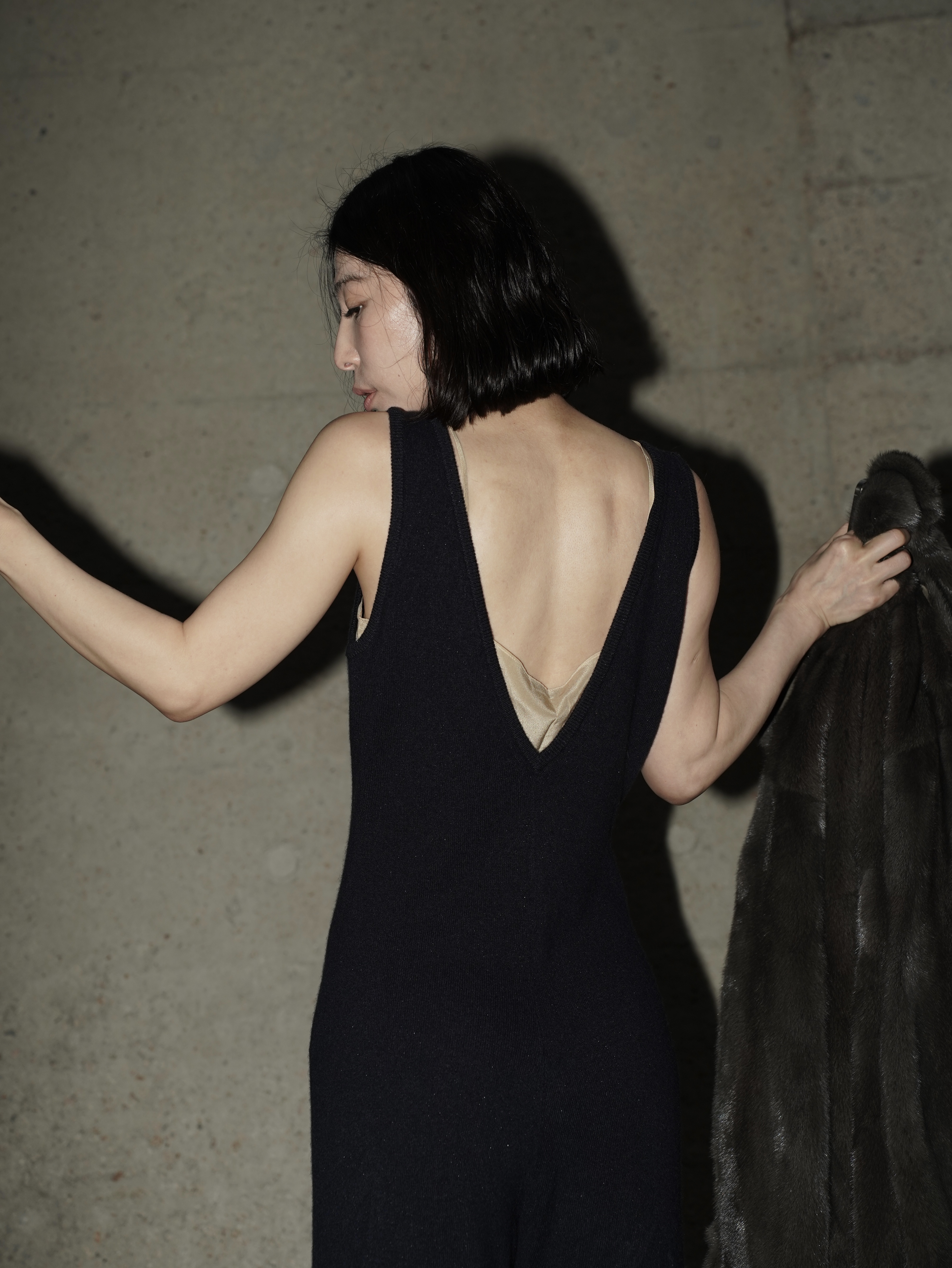 HANAA 秋冬新款純康賽尼羊絨珠片細閃V領無袖連體褲