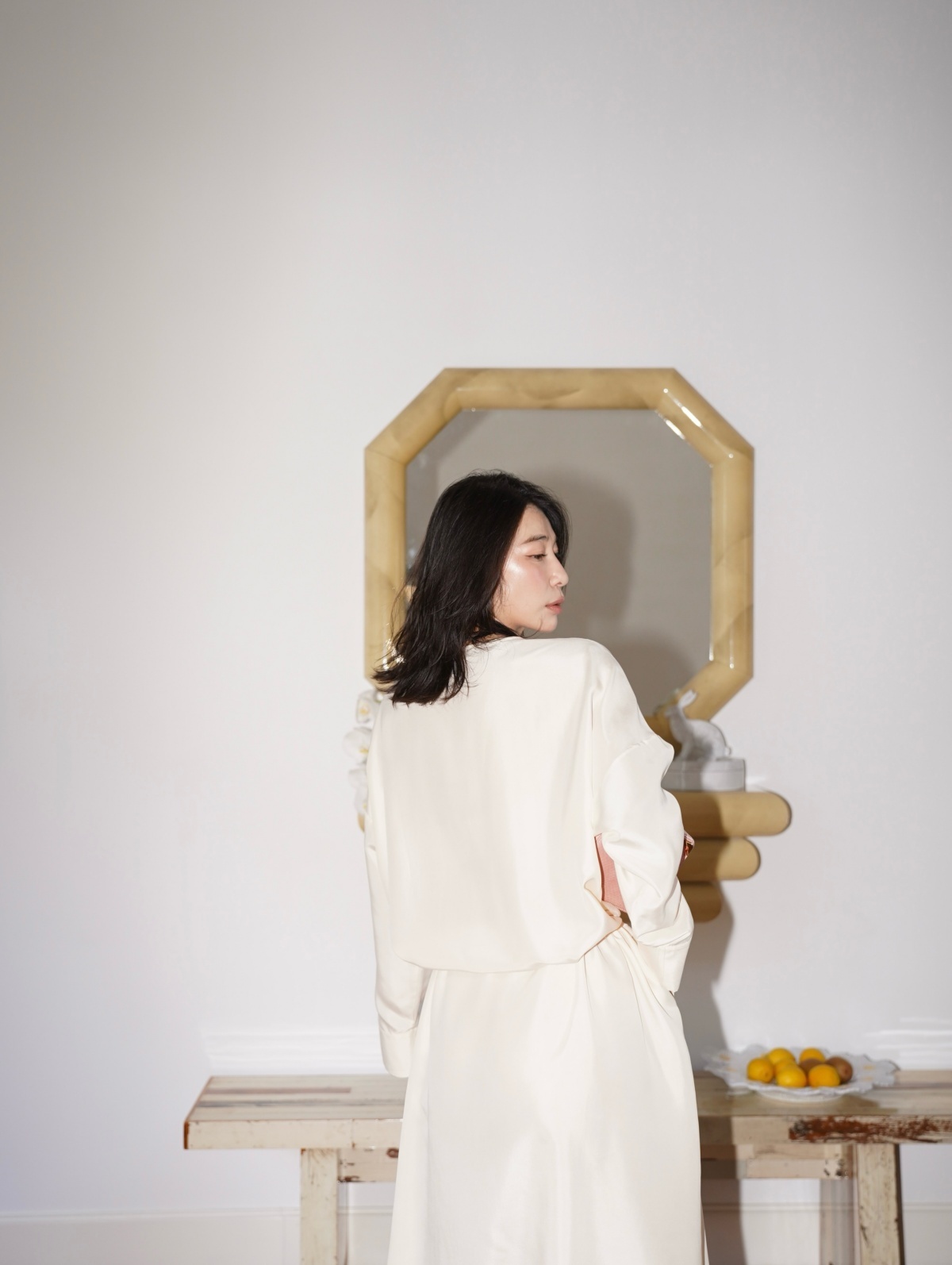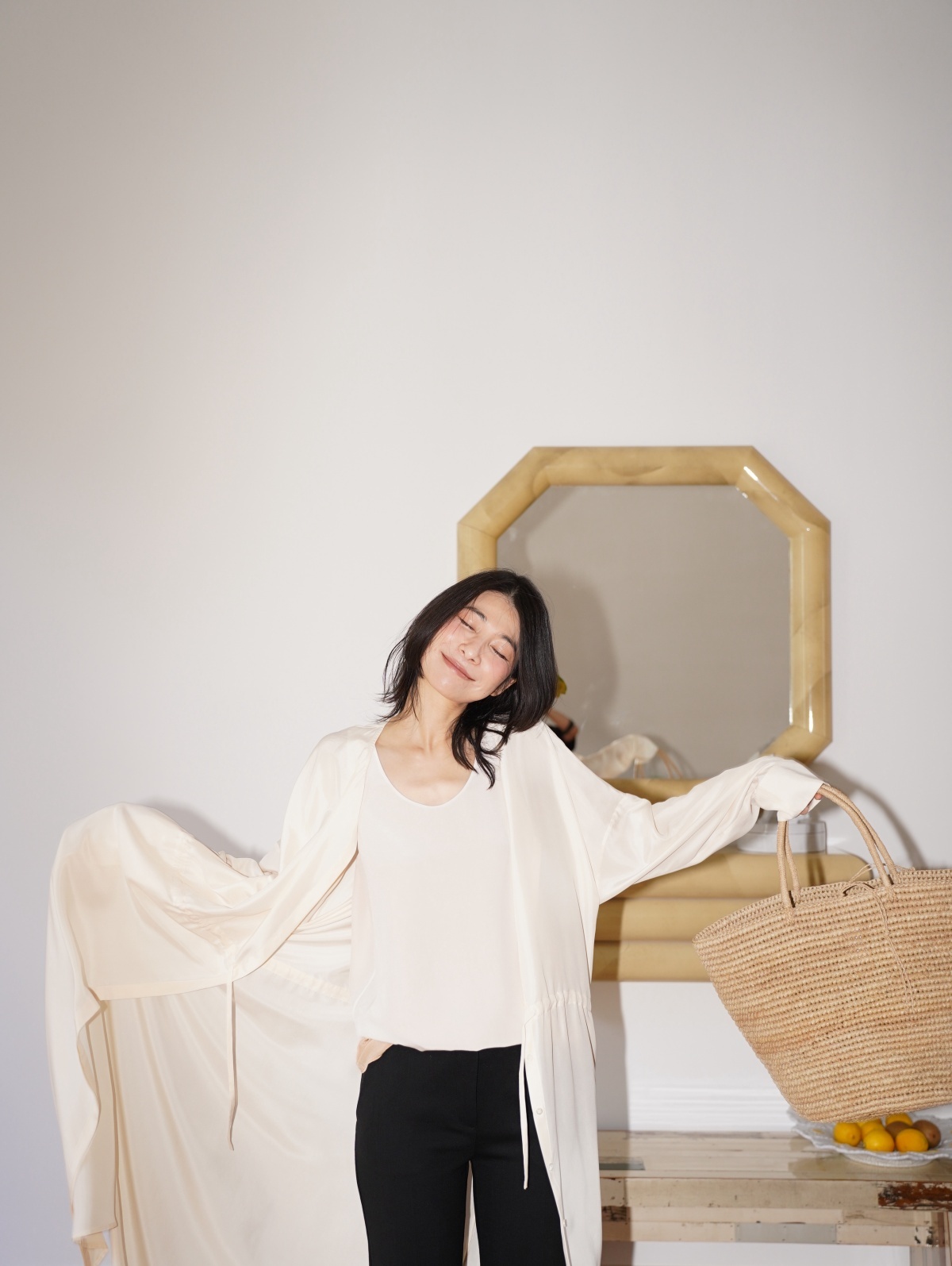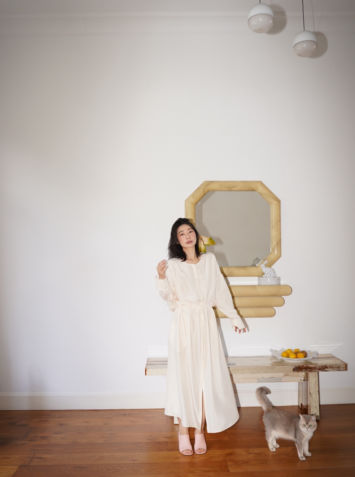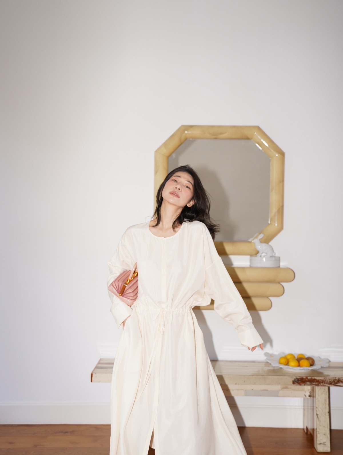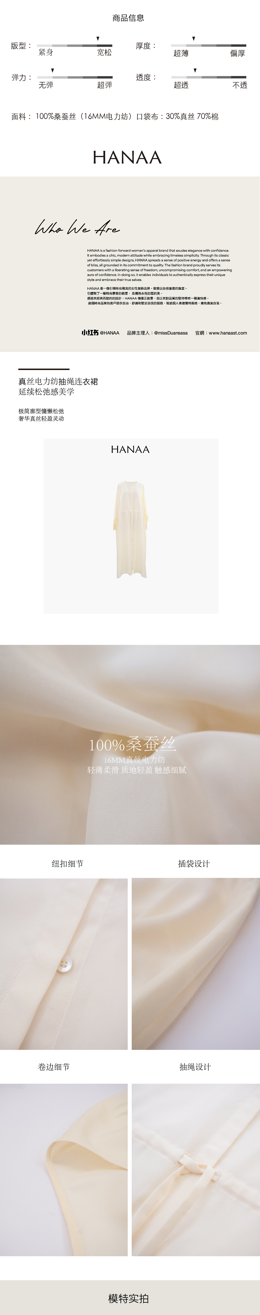 HANAA 新款淡黃色16MM真絲電力紡抽繩廓形連衣裙