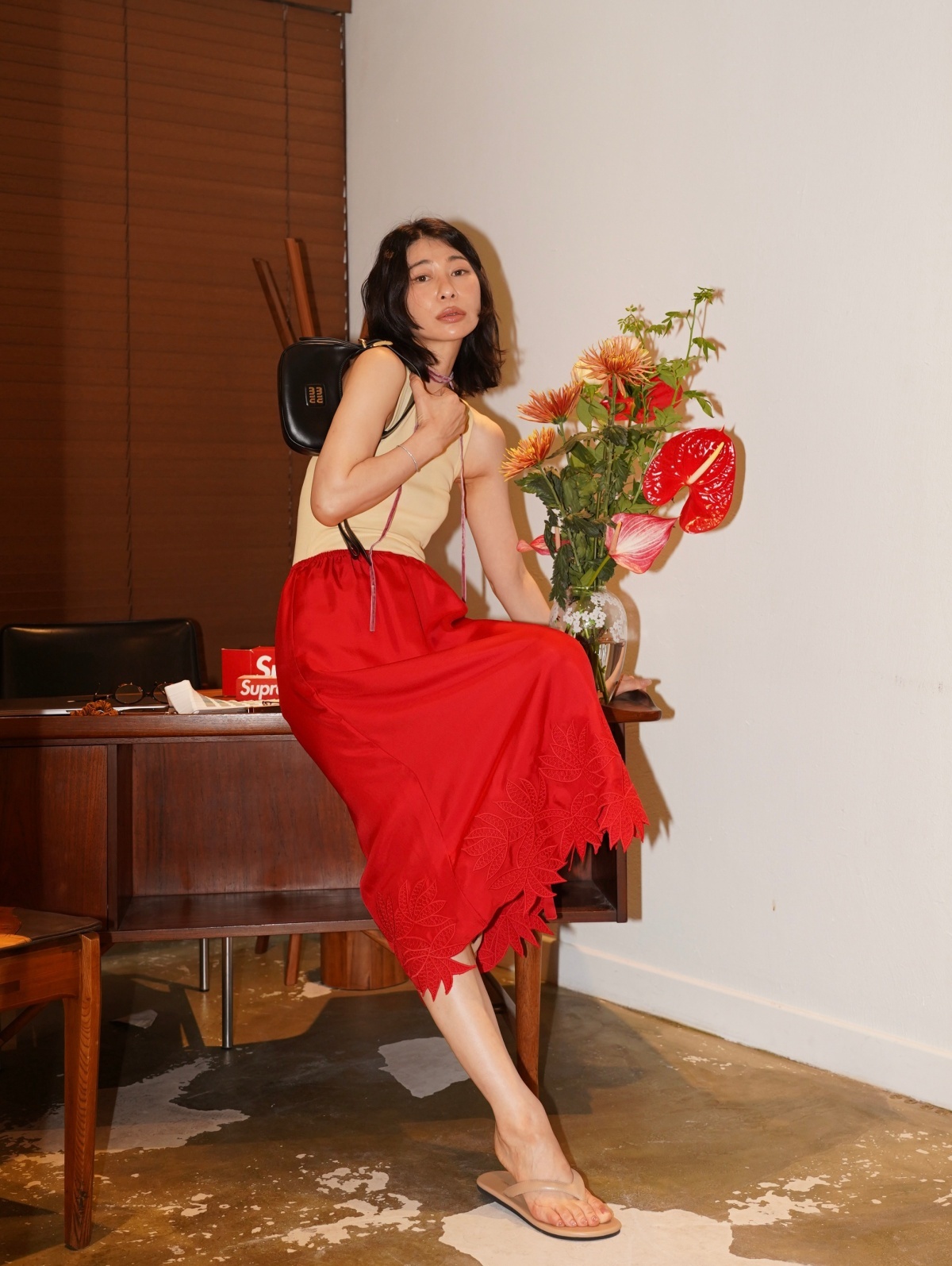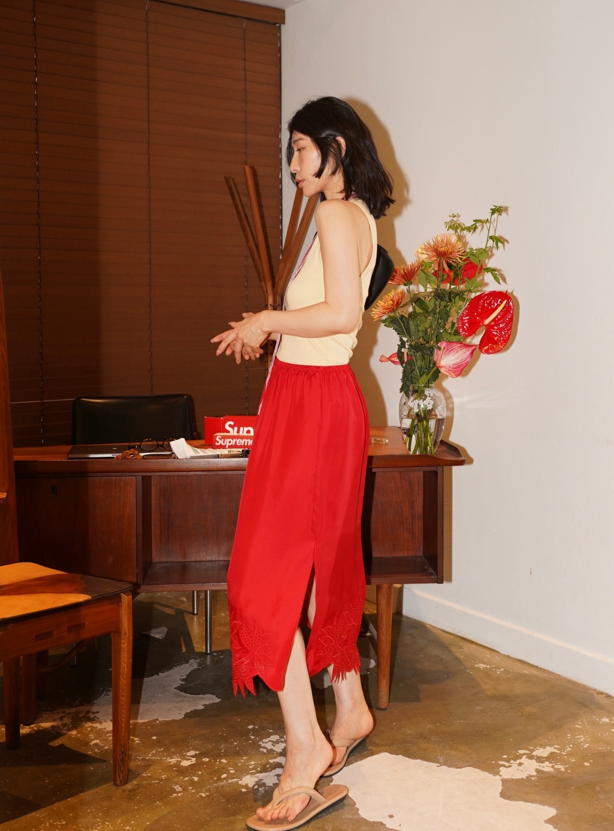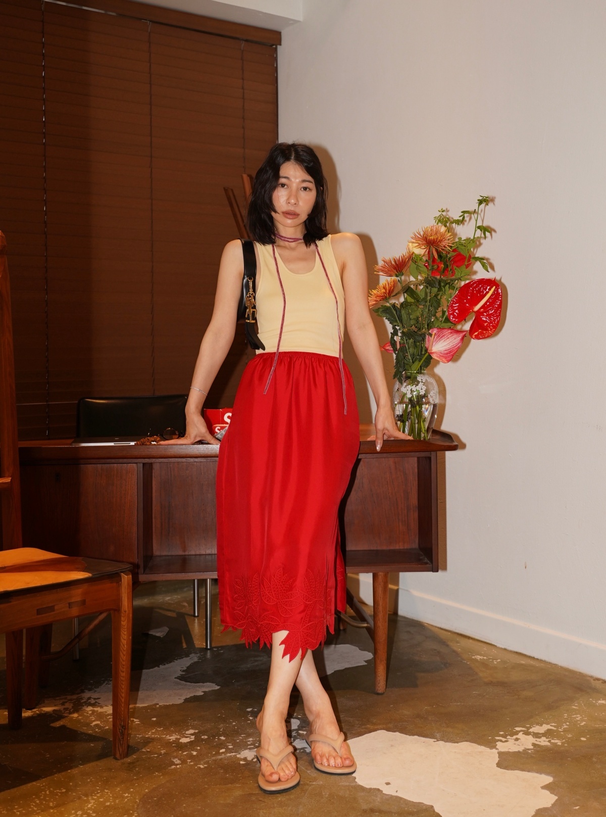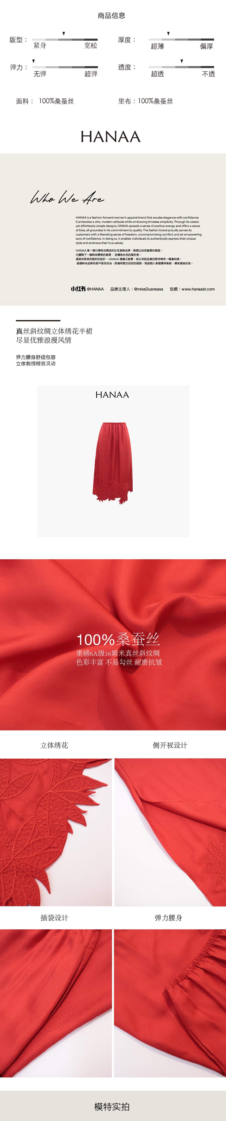 HANAA 新款6A级16姆米真絲斜紋綢立體繡花手工剪邊側開叉半裙