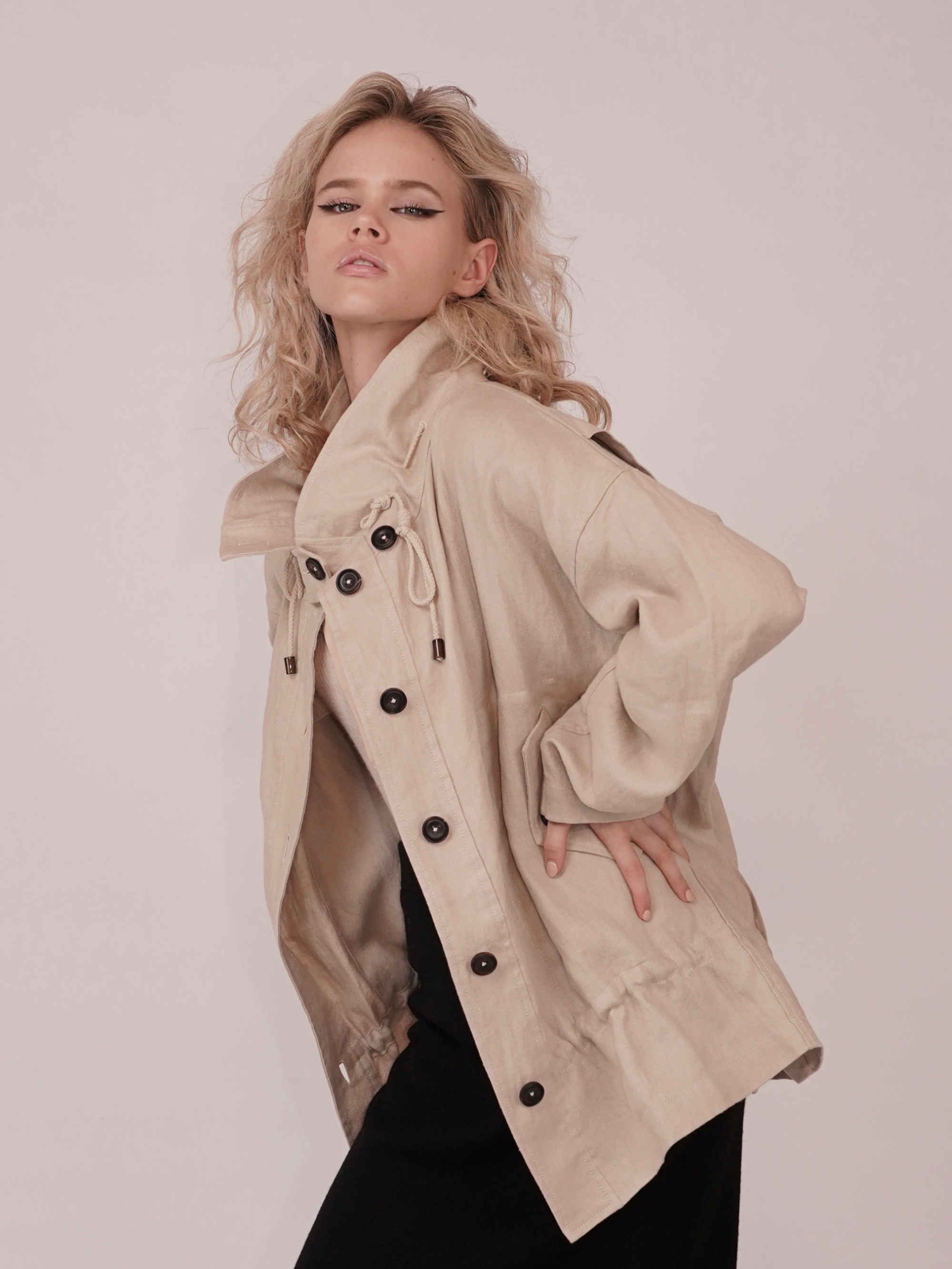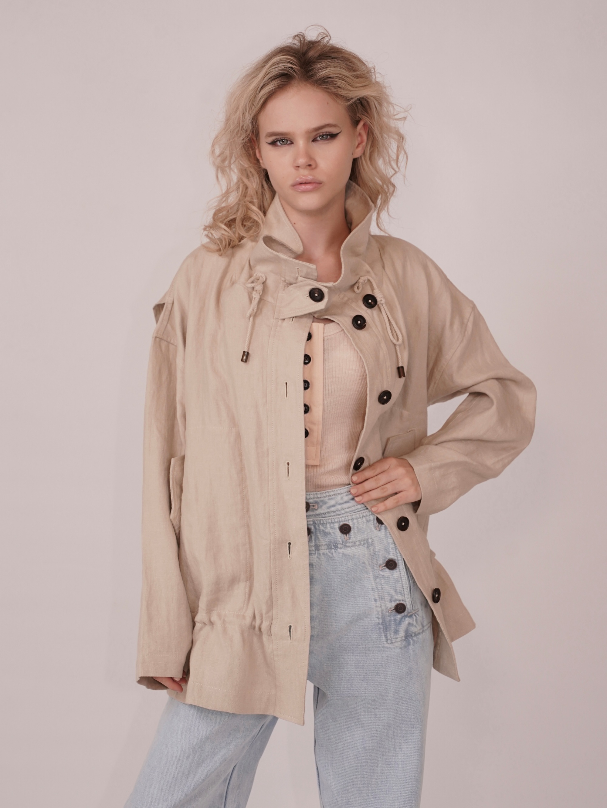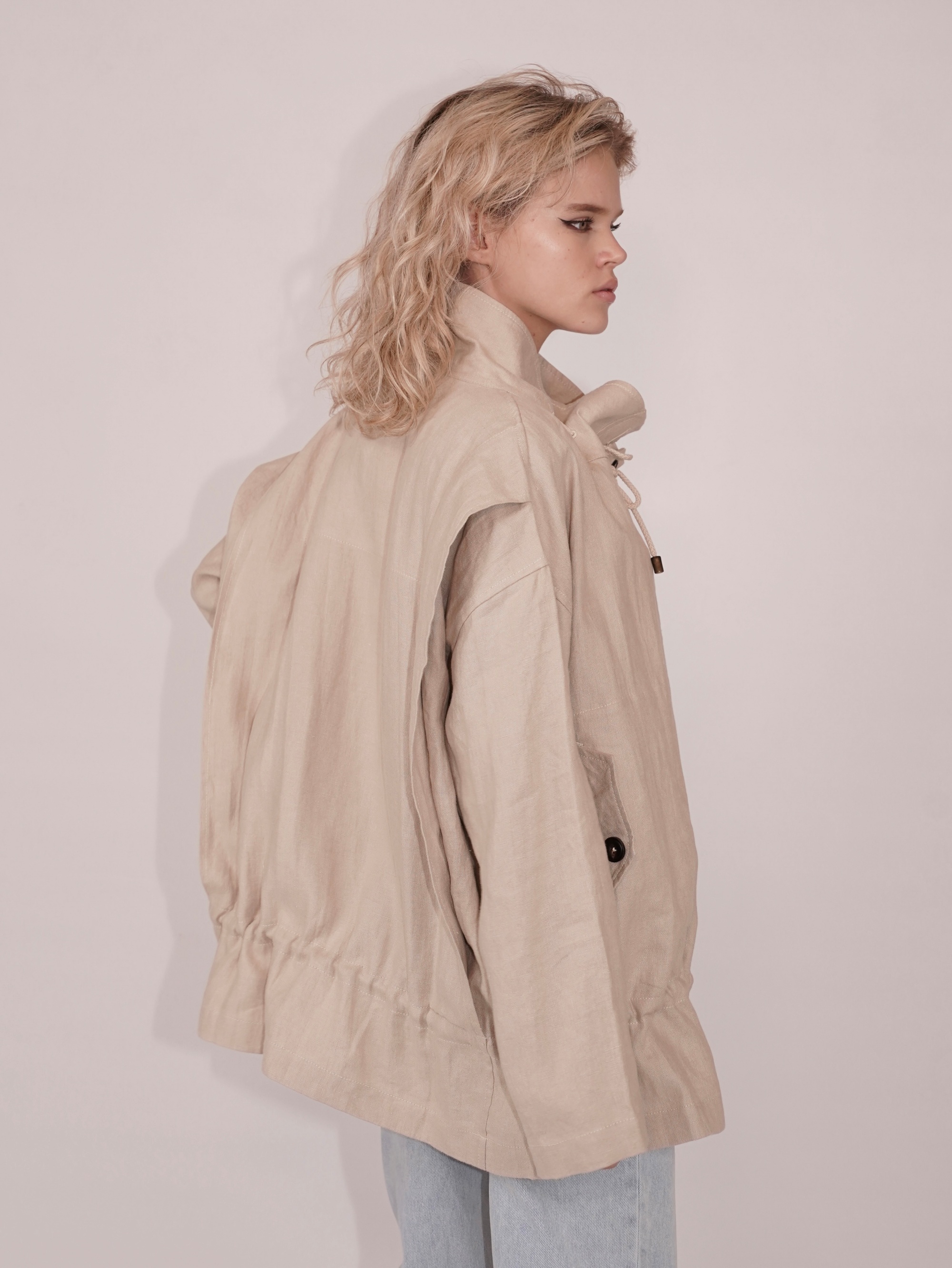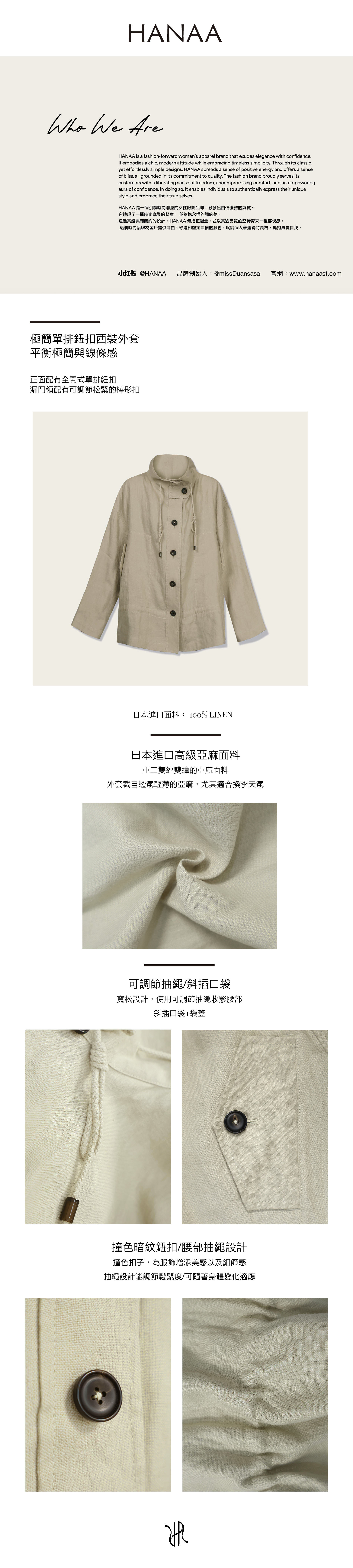 HANAA新款進口亞麻休閒立領抽繩夾克外套