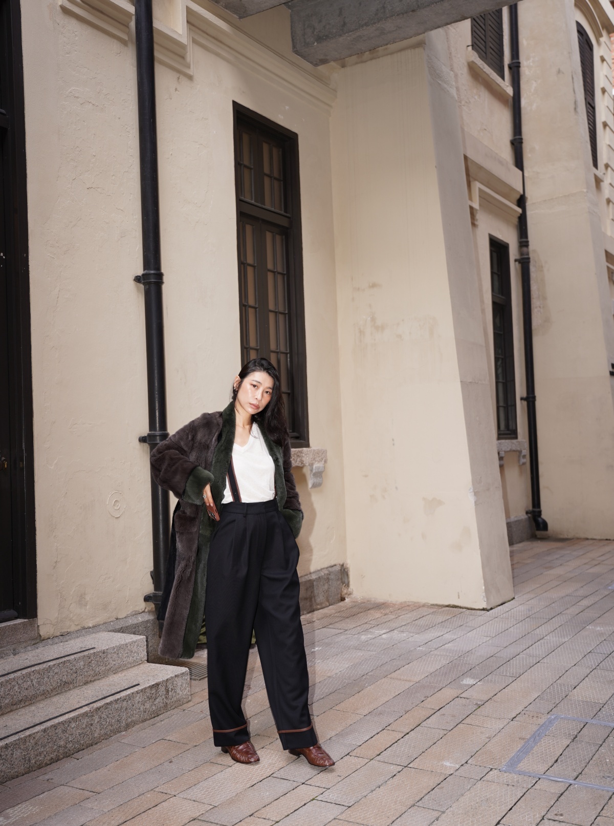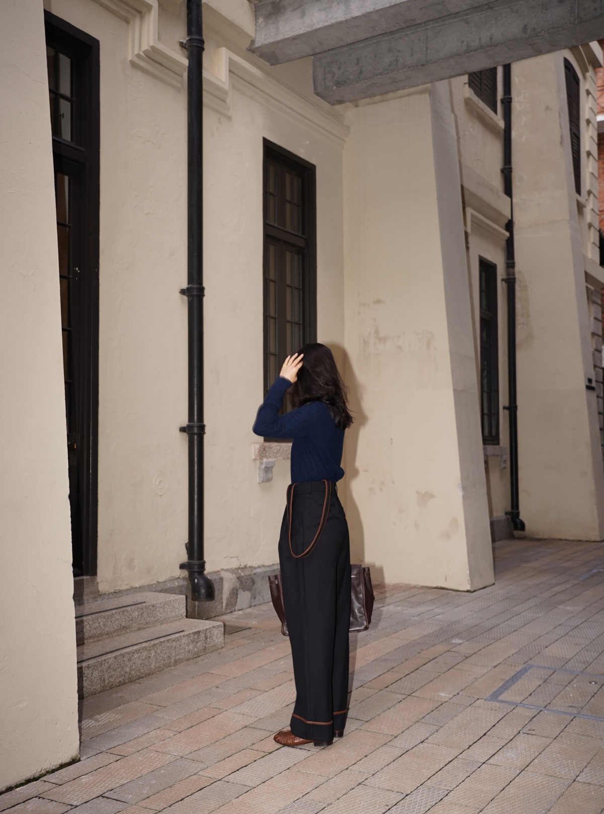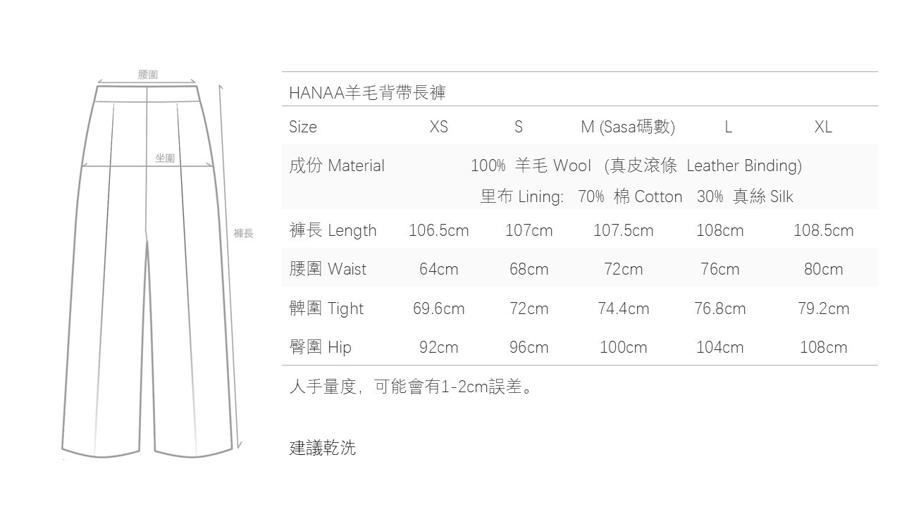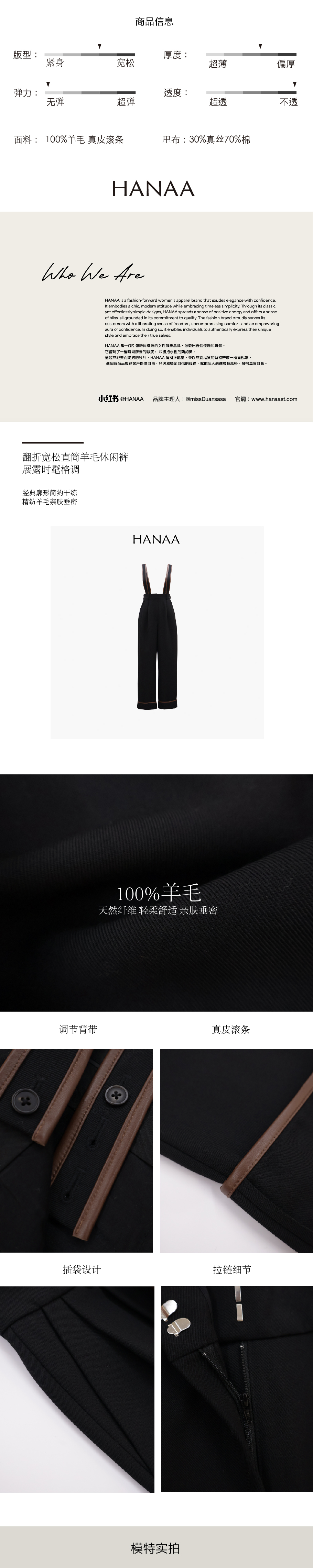HANAA 新款羊毛翻折寬鬆直筒可調節休閒背帶褲