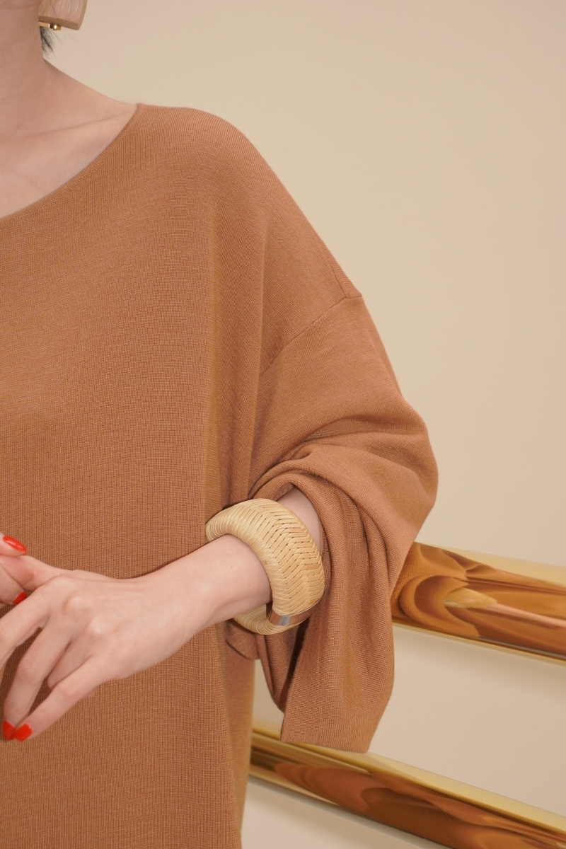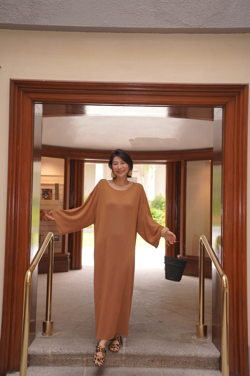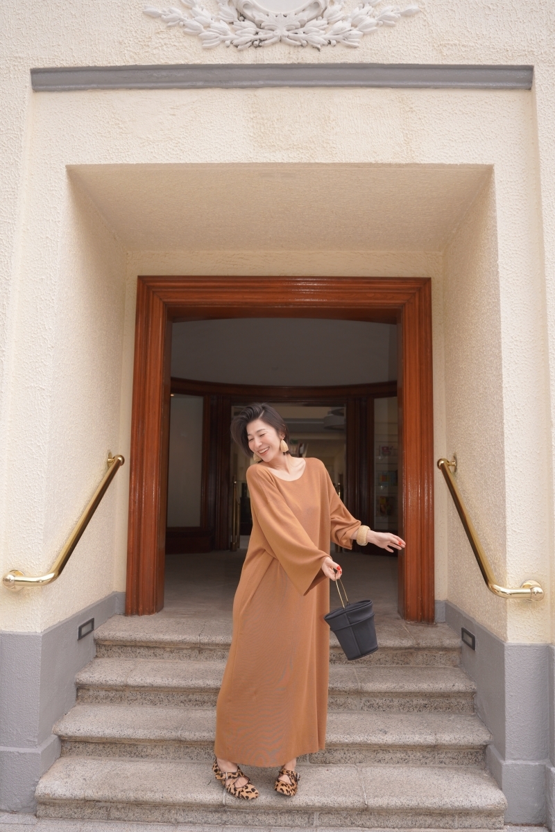 HANAA早春新款氣質薑黃色慵懶風羊毛真絲連衣裙圓領寬鬆打底長裙