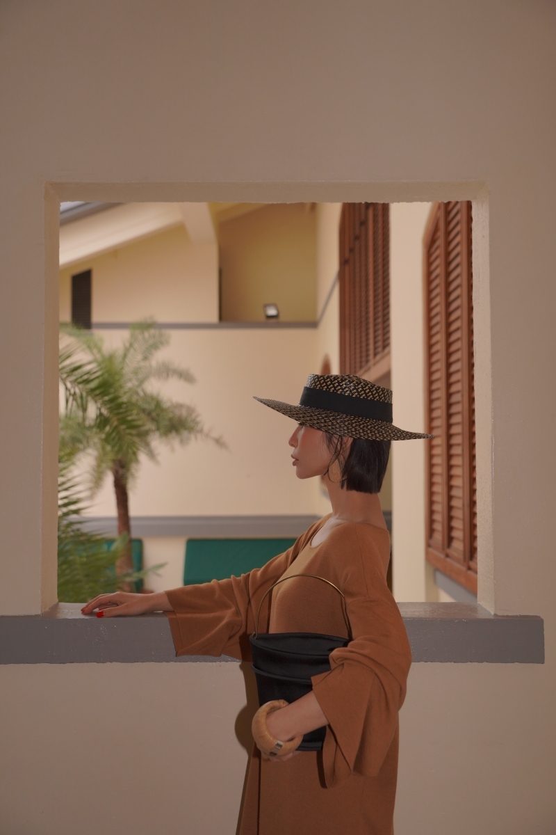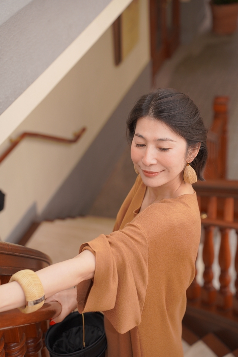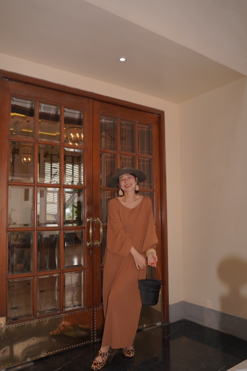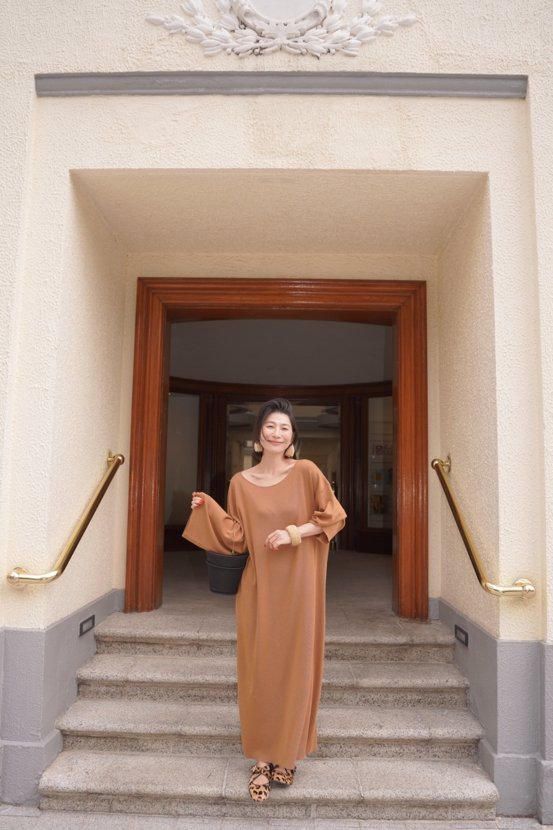 HANAA早春新款氣質薑黃色慵懶風羊毛真絲連衣裙圓領寬鬆打底長裙